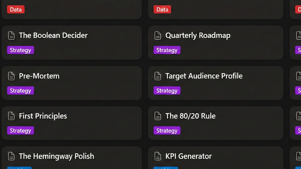 π£ Module 2: Strategy (The Architect) Stress-test your ideas. Includes The Boolean Decider, Pre-Mortem Simulation, and First Principles Analysis.